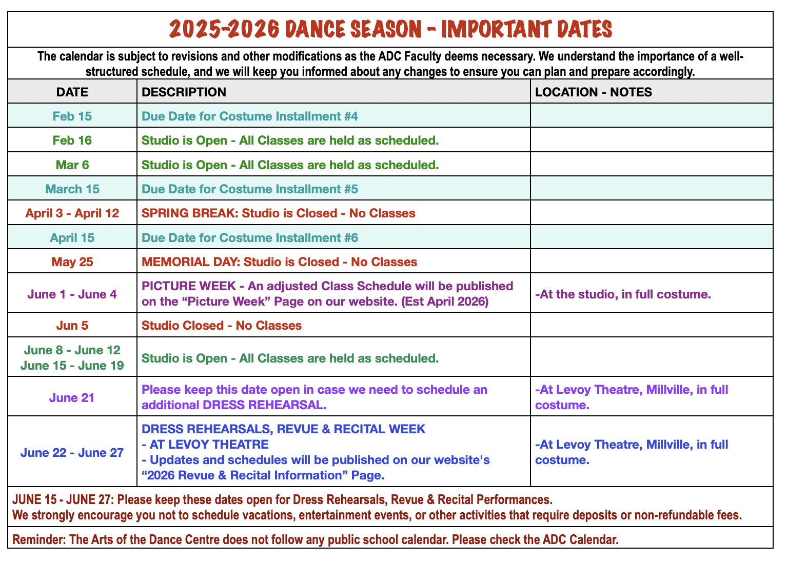 Preregistration for our 2026 Summer Dance Program & 2026-2027 Dance Season is open. The schedules will be announced as follows: